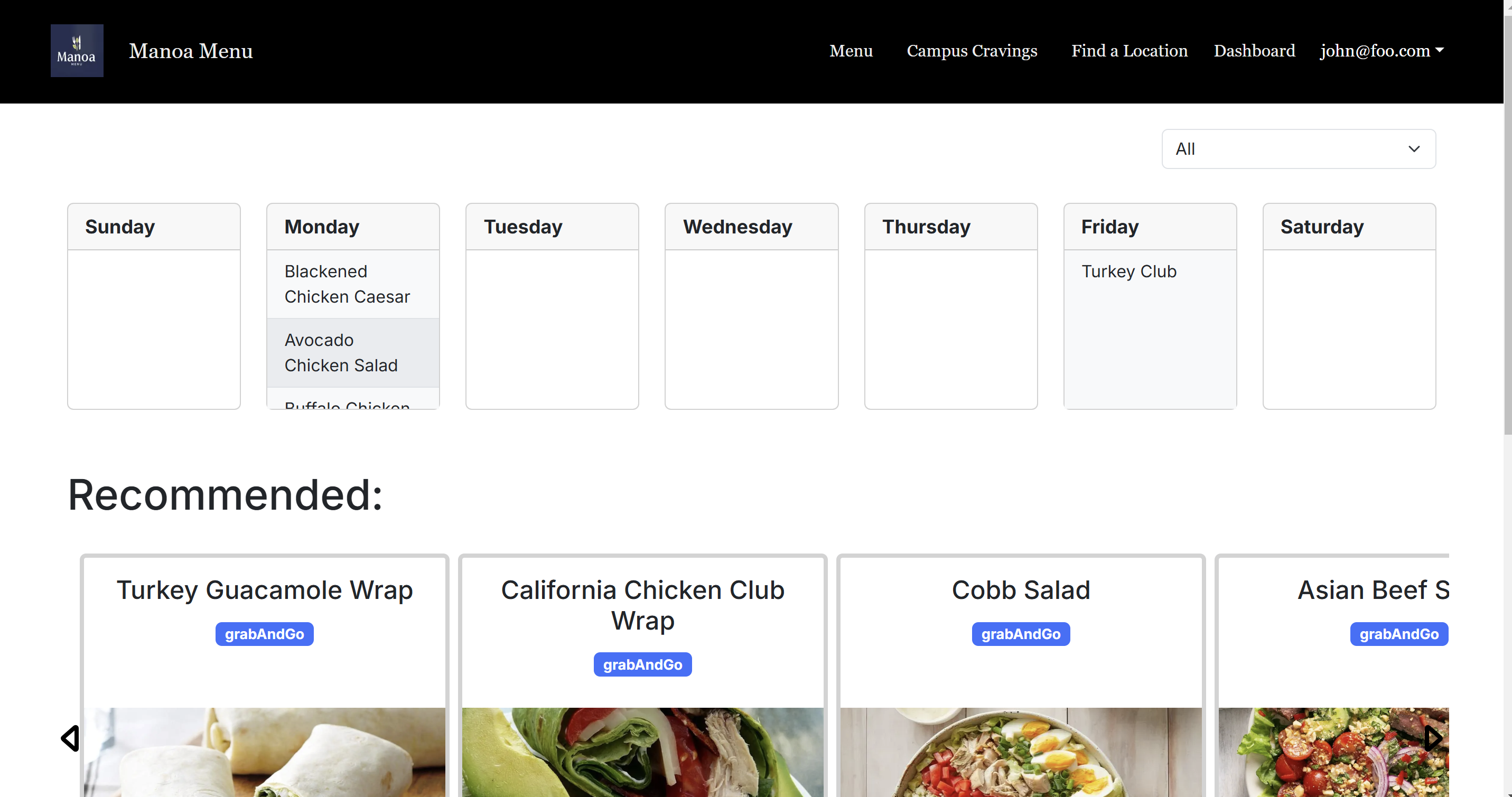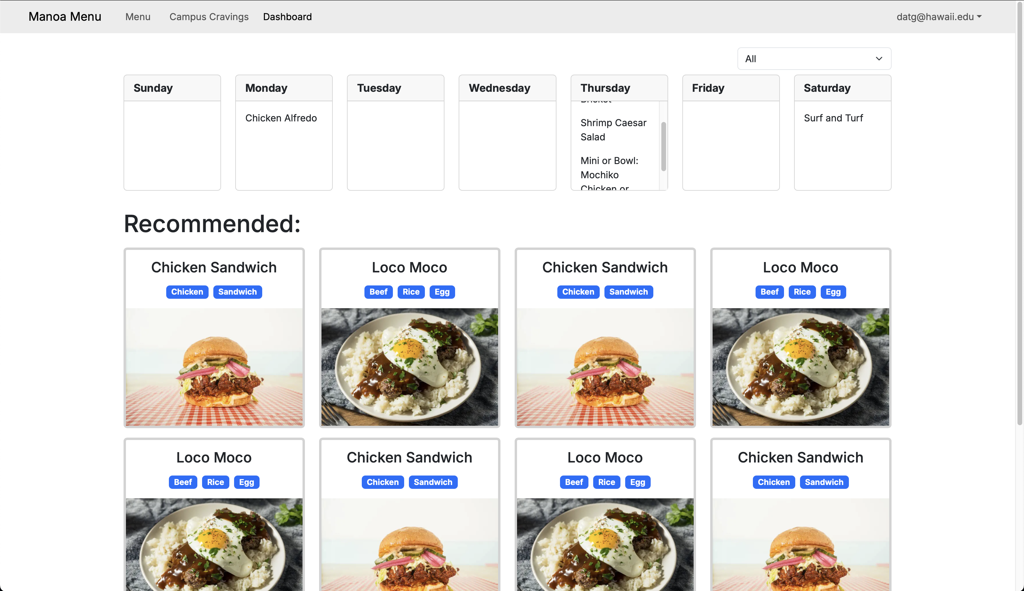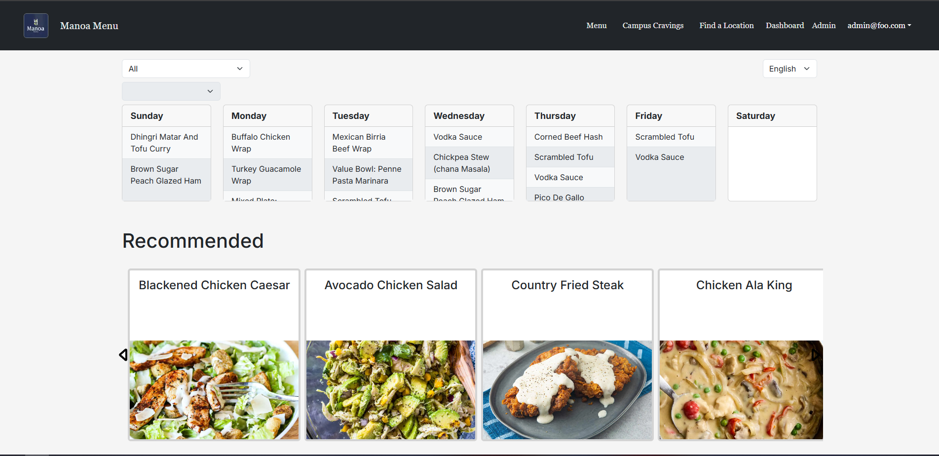 Before we had a functional landing page, each and every one of us drew a mockup for what our pages would look like. Since I was in charged of the dashboard page, my main focus was getting the users' their favorite food for the week and maybe a recommended feature. The calendar would serve as a reminder that the food that you want is returning on certain days. We had decided to use the Campus Center Food Court as well as Gateway Cafe and Hale Aloha Cafe, because they all uses a rotating schedule. This allows us to call for new schedule and fetch it to update our menu. The recommended feature is an additional challenge to fetch an image for the food so that internation students would know what they look like. It would also use an algorithm that features sorting and a max-heap.