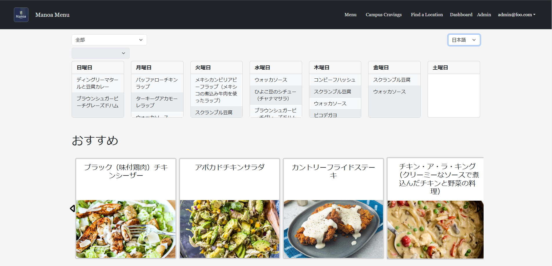 Now back to the current Dashboard, this version now supports the Japanese language and the ability to favorite items. In milestone 3, we have finally enable support for Gateway Cafe and Hale Aloha Cafe, which needed location filters within the dashboard page. The language toggle will also support future languages because I wrote the code with that in mind. Futhermore, my second biggest contribution is the star button and its ability to remove and add items to the user's favorites. This star button is also used in the Menu page, only after the user has logged in. Also, because the dashboard page pulls a lot of information from the database, I had stored a lot of fetch information into the local storage to reduce load time on subsequent reloads. This was because each load used to take from 5-10 seconds which would be too long from a user's perspective. Aside from that, the food card in Recommended and the day card in Calendar are both clickable, which will present the user with a central modal that allows the user to use star button.